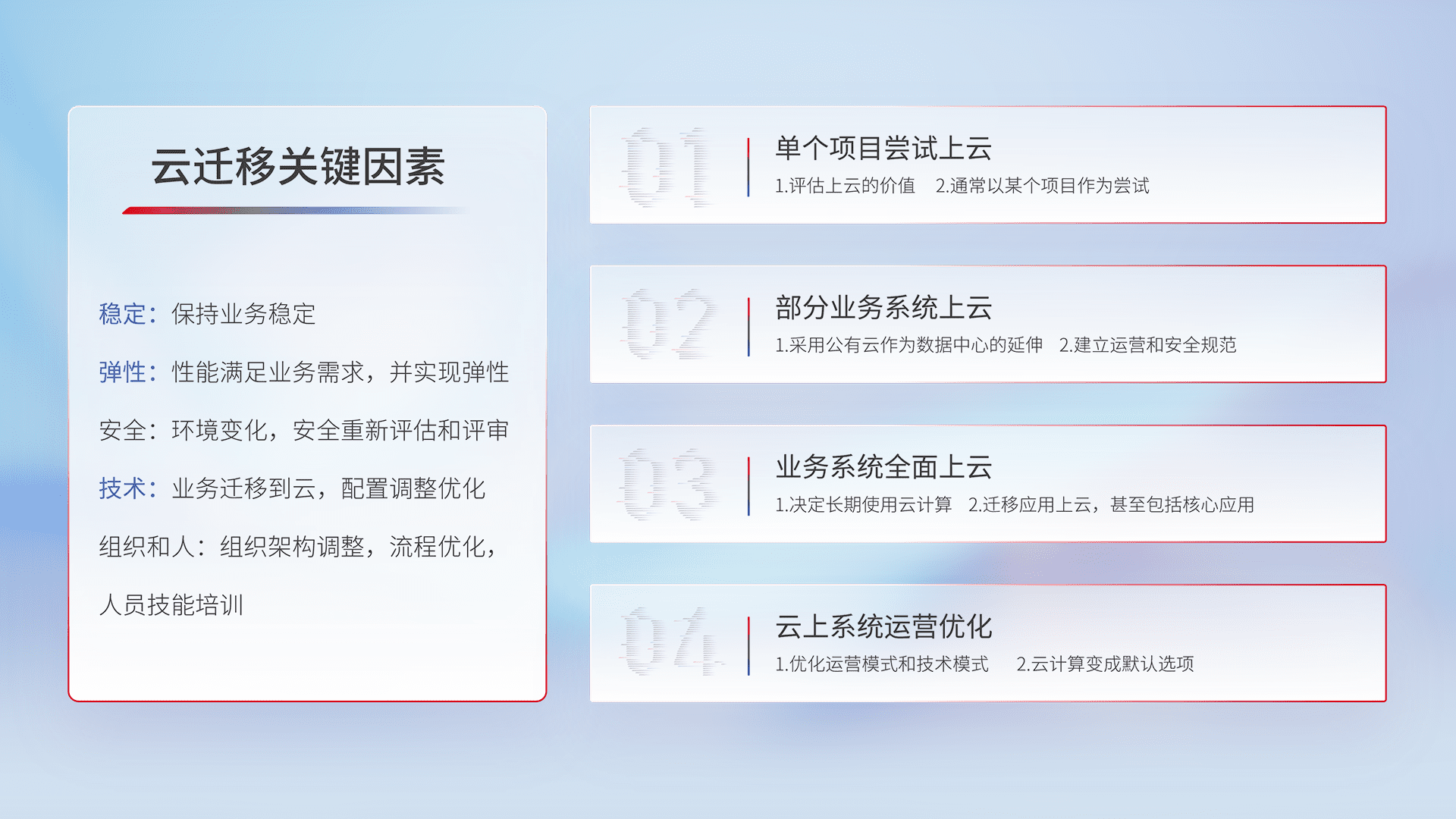 结合实际业务,,,从规划设计、、云平台选型、、云原生改造、、、、数据迁移、、、集成交付,,,迁移全过程为客户识别最佳上云路径,,做好风险识别管理,,设计网络架构、、、身份权限、、、安全审计合规、、、、操作审计、、、、日志审计、、监控告警策略、、、多站点容灾设计等,,,对云上基础设施进行整体规划,,提升IT治理水平,,以满足弹性、、、高可用、、、、高性能的需求。。。。