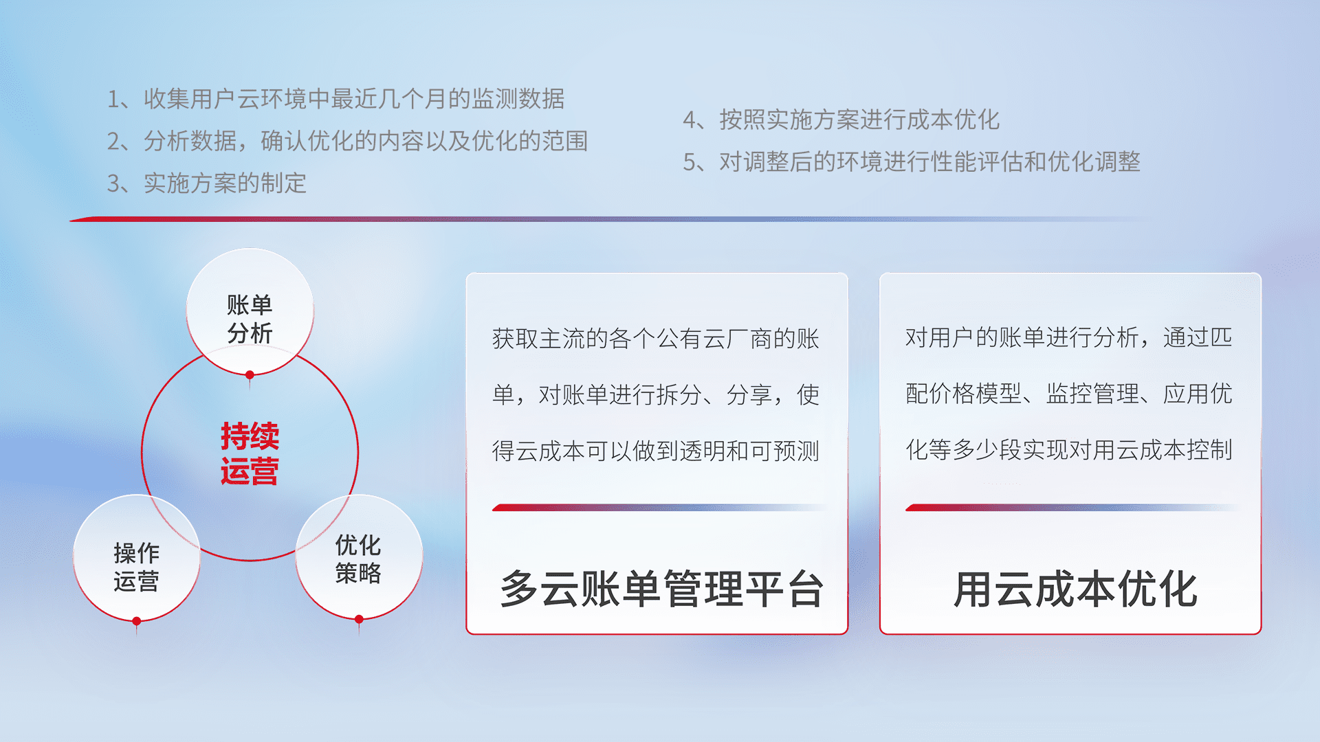 通过多云纳管,,,,以统一的资源数据模型把客户的云资源进行抽象和封装,,进而实现对多云资源的统一操作,,,,保障云资源管理的可靠性、、稳定性与可用性。。。量身定制化运维内容,,,配置、、开发运维、、、补丁管理、、备份、、监控、、认证和访问管理、、、审计和日常巡检等,,保障在用云过程中的可靠度,,稳定度以及高可用率。。